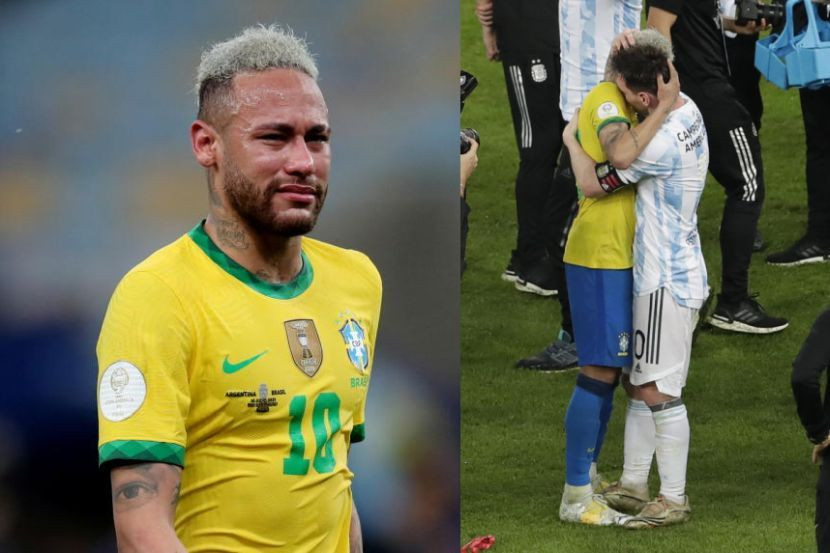 Foto kiri Neymar menangis selepas perlawanan akhir Copa America 2021, foto kanan Neymar ditenangkan oleh Messi. foto Reuters / AP