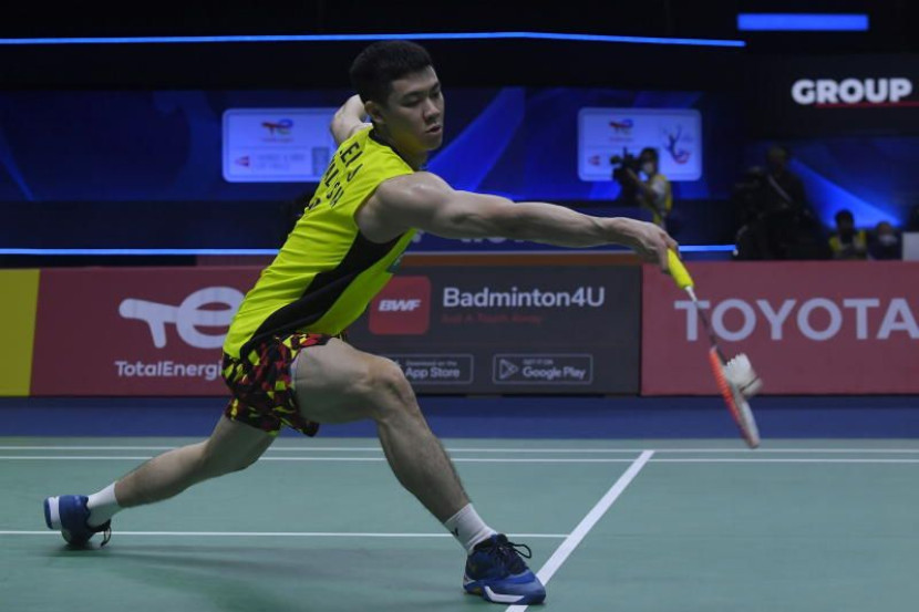 Pemain badminton perseorangan negara, Lee Zii Jia ketika beraksi menentang pemain dari England Toby Penty pada Kejohanan Piala Thomas di Stadium Impact Arena Bangkok, pada Isnin. Fot: Bernama