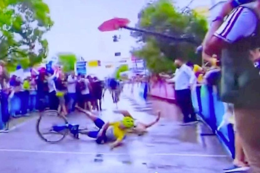 SEORANG pelumba basikal profesional yang sedang memecut ke garisan penamat tanpa sengaja merempuh seorang penonton yang sedang mengambil gambar.