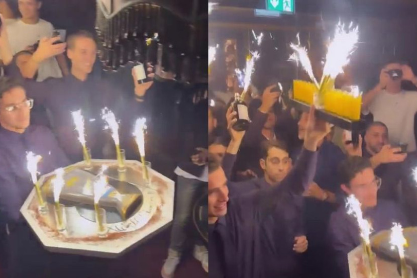 Rakan rapatnya Louis van Baar memuat naik klip di Instagram dari parti rahsia itu ketika Verstappen dihadiahkan dengan kek besar berbentuk trofi.