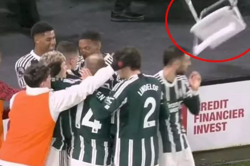 SEBUAH kerusi dibaling ke arah pemain Manchester United yang sedang meraikan gol kemenangan 2-1 menentang Sheffield United, pada Sabtu.