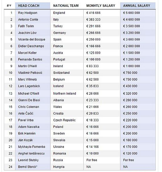 PENGURUS England, Roy Hodgson muncul sebagai jurulatih yang menerima gaji tertinggi di kalangan pengendali lain dalam saingan Euro 2016.