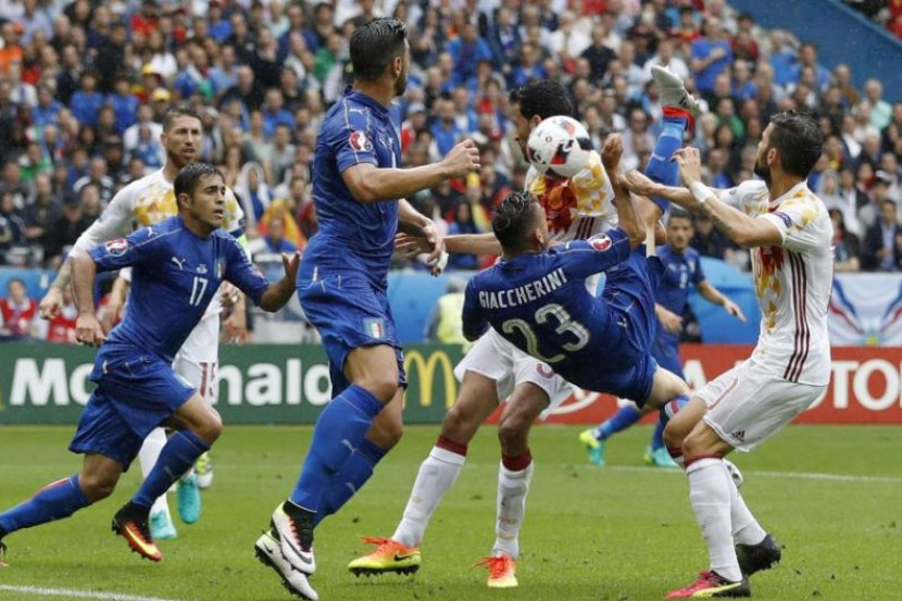Perlawanan yang berlangsung dalam keadaan hujan di awal permainan, menyaksikan Itali bermula garang dengan dua percubaan dalam tempoh 10 minit menerusi tandukan Pelle dan sepakan gunting Emanuele Giaccherini tetapi berjaya ditepis De Gea.