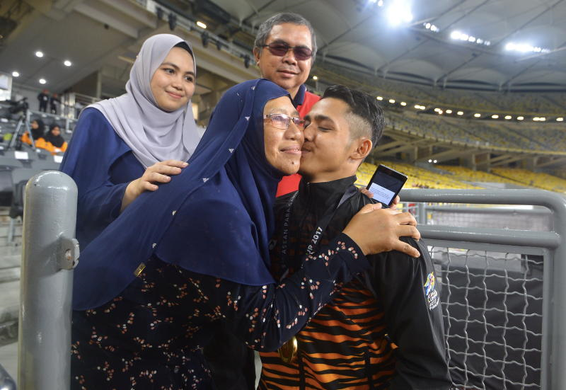 BUKAN sahaja pantas berlari, tetapi atlet paralimpik negara Muhamad Afiq Mohamad Ali Hanafiah mempunyai beberapa bakat terpendam. Pelari pecut 100 meter kelahiran Johor ini mengakui dia tidak pernah mengimpikan untuk menjadi atlet negara. Namun kekurangan dari segi penglihatan bermula usia 13 tahun tidak menghalang Afiq untuk bergiat aktif dalam bidang sukan. “Ketika usia 12 tahun penglihatan saya mengalami masalah katarak dan perlu menjalani pembedahan mata. “Tetapi sedikit kemalangan berlaku apabila mata yang baru dibedah itu terkena siku seorang kanak-kanak, ketika mata masih dibalut menyebabkan ia membengkak. “Lama-kelamaan sebelah mata semakin hari semakin kabur ,” ujarnya memulakan bicara kepada mStar Online. Afiq kini melebar sayapnya dalam bidang perniagaan salun rambut. Jelas Afiq lagi, biarpun kehilangan deria penglihatan, ia tidak menghalangnya untuk aktif dalam sukan ragbi. “Tetapi ketika usia 15 tahun ayah melarang saya terus aktif sukan ragbi kerana risau kemungkinan dilanggar. “Jadi saya mengambil keputusan terlibat dalam olahraga. Pada 2010 saya mula mewakili Para Sukma sebelum mewakili negara lima tahun kemudian,” jelasnya yang merupakan pemenang pingat gangsa Sukan Komanwel 2018. Menurut Afiq, sebelum bergelar atlet dia sudah mula berdikari mencari duit sendiri, tidak hanya bergantung kepada keluarga. Afiq mencium ibunya, Zainab Asrani ketika meraih pingat emas Sukan Para Asean 2017. Turut bersama bapa serta kakaknya, Maisarah. “Saya mengikuti kursus refleksologi dan mengurut. "Dengan adanya sijil sah, saya mula bekerja sebagai tukang urut di Sg Wang pada waktu pagi dan sebelah malam di Downtown Cheras pula,” katanya. Bagaimanapun, kerjaya mengurut itu terpaksa dihentikan selepas dipanggil menjadi atlet sepenuh masa. “Cuma sesekali kalau kawan-kawan minta tolong urut tu, ada la juga saya tolong,” ujar anak bongsu daripada empat adik beradik ini. Pemenang pingat emas Sukan Para Asean 2017 itu juga turut berkongsi perkembangan terkini tentang dirinya. “Memandangkan ada juga kelebihan menggunting rambut, saya dah buka Gent Touch Barber Shop di Pandan Mewah. “Alhamdullilah ramai kawan-kawan atlet datang menggunakan khidmat saya, termasuk Wan (Riduan Puzi),” katanya yang bersyukur dengan kelebihan yang dimiliki. Malahan atlet berpotensi ini menganggap apa sahaja yang dikecapinya ketika ini adalah sokongan penuh keluarga dan rakan-rakan.
