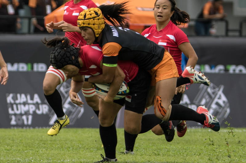 Pemain Malaysia Dayang Manggie (kanan) menyekat kemaraan pemain Singapura Ow Yong Yu Xiu (kiri) pada perlawanan ragbi 7 sebelah wanita diantara pasukan Malaysia dengan pasukan Singapura. - fotoBERNAMA