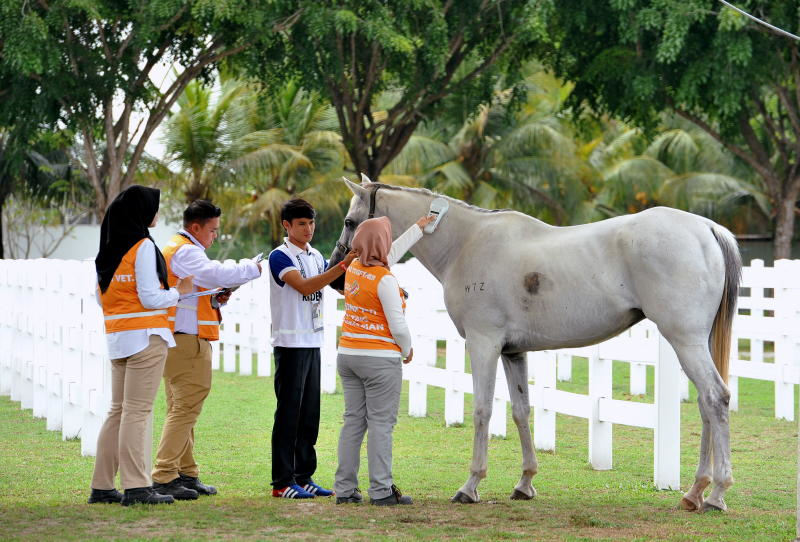 Pegawai veterinar membuat pemeriksaan terakhir terhadap kecergasan seekor kuda atlet dari Kamboja di Terengganu International Endurance Park.- fotoBERNAMA