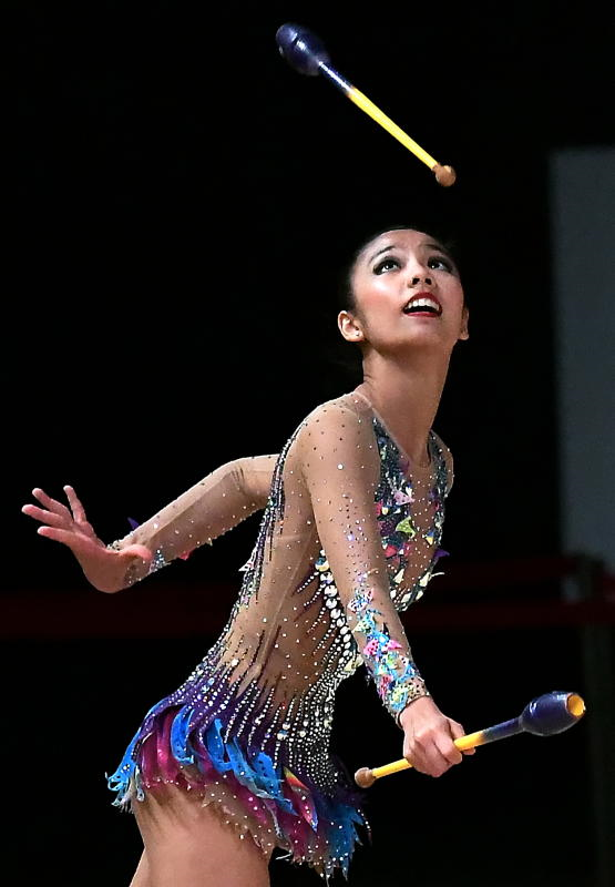 Gimnas berirama negara, Koi Sie Yan beraksi dalam disiplin Ribbon Berpasukan Gimnastik Berirama.