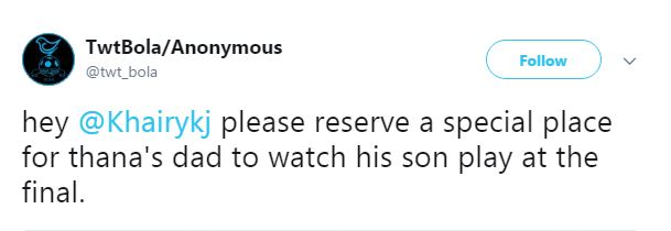 Status yang dimuat naik oleh TwtBola: "Hei @khairykj tolong sediakan tempat istimewa buat bapa Thana untuk saksikan anaknya bermain pada final."