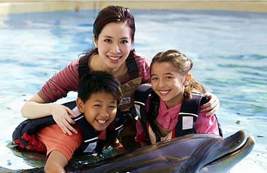Anda boleh berkenalan dengan ikan lumba-lumba dengan cara turun ke dalam kolam dan memberinya makan di Marine World I Summit.