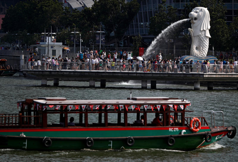 Pelancong berkumpul di hadapan mercu tanda 'Merlion' di Singapura untuk mengambil gambar.