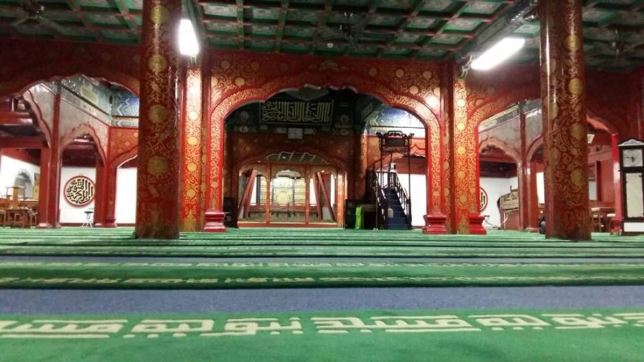 Ruang dalam dewan Masjid Niujie yang dipenuhi warna hijau dan merah.