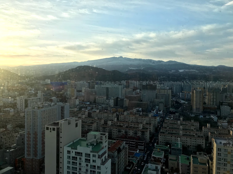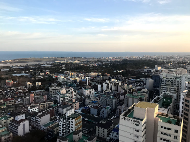 Pemandangan dari tingkat atas hotel ini sangat indah dengan panorama Gunung Hallasan yang diselaputi salju putih, laut yang biru dan juga pemandangan pesawat yang berlepas dan mendarat di Lapangan Terbang Antarabangsa Jeju.