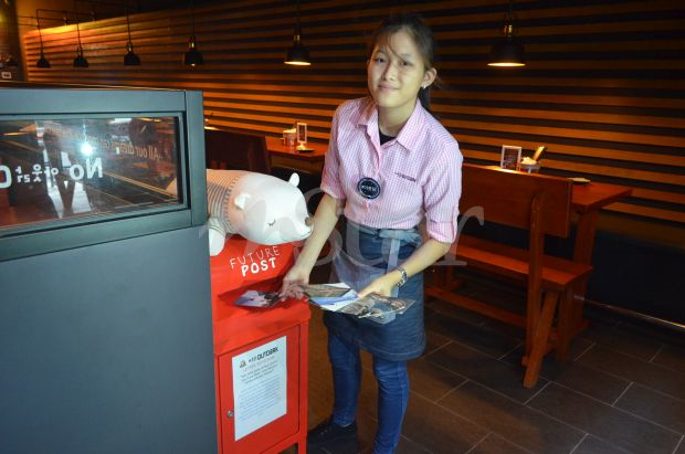 Melangkah setapak lagi, Cik Dhia ternampak peti pos berwarna merah yang digunakan untuk mengepos poskad kepada diri sendiri, tapi untuk masa depan.
