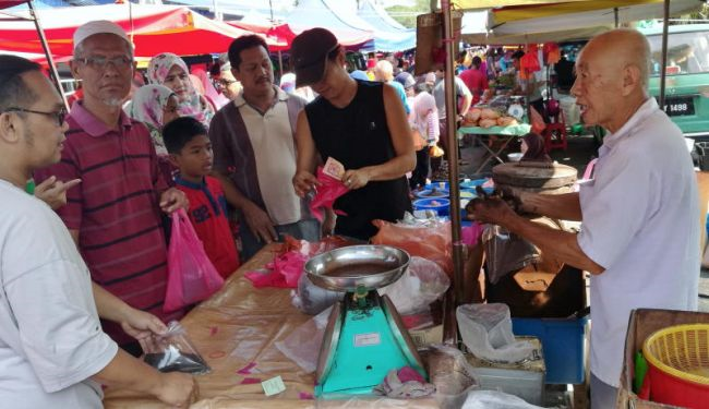 Selain patin, sayur kampung dan kuih-muih tradisional, terdapat produk lain yang sering kali menjadi tumpuan ramai di pasar pekan sehari ini iaitu kopi dikisar sendiri oleh seorang warga emas, Wong Tiang Kuang 75.