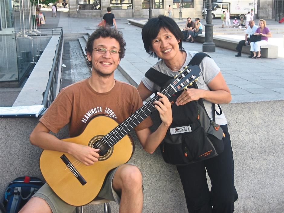 Chee Shok Fong bersama pemuzik jalanan di Madrid, Sepanyol.