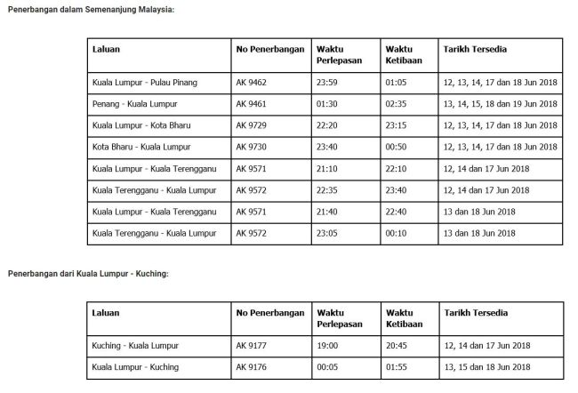 PETALING JAYA: Bagi mereka yang belum mendapatkan tiket untuk pulang beraya ke kampung halaman, AirAsia menawarkan tiket lewat malam dengan kadar tetap rendah bermula 12 hingga 19 Jun ini. Menerusi tawaran ini, kadar tambang yang ditetapkan adalah RM99 untuk laluan terpilih dalam Semenanjung Malaysia dan RM149 dari Kuala Lumpur ke Kuching. Tiket-tiket boleh mula dibeli sekarang. Ketua Pegawai Eksekutif Air Asia Malaysia, Riad Asmat berkata, syarikat penerbangan itu berbesar hati untuk memenuhi permintaan perjalanan khususnya sempena ketibaan Aidilfitri tidak lama lagi. "Selalunya tambang akan naik apabila permintaan meningkat. Tetapi, kami ingin memastikan rakyat Malaysia dapat pulang untuk meraikan Hari Raya Aidilfitri dengan orang yang tersayang. "Kami mendengar permintaan rakyat untuk penerbangan tambang rendah. "Justeru itu kami berbesar hati untuk mengumumkan penerbangan tambahan dengan tambang tetap RM99* untuk laluan terpilih di Semenanjung Malaysia dan RM149* untuk laluan antara Kuala Lumpur dan Kuching," katanya dalam satu kenyataan, Rabu. Bagaimanapun penerbangan Balik Raya istimewa ini hanya untuk tempahan baharu sahaja dan tertakluk kepada ketersediaan tempat duduk. Sementara itu, AirAsia turut menambah 43 kekerapan penerbangan dari Kuala Lumpur, Johor Bahru dan Kuching sempena hari raya Aidilfitri. Antara destinasi yang terlibat dalam promosi ini ialah Kuala Lumpur - Pulau Pinang, Pulau Pinang - Kuala Lumpur, Kuala Lumpur - Kota Bharu, Kota Bharu - Kuala Lumpur, Kuala Lumpur - Kuala Terengganu dan Kuala Terengganu - Kuala Lumpur. Ia turut melibatkan penerbangan Kuching - Kuala Lumpur dan Kuala Lumpur - Kuching.