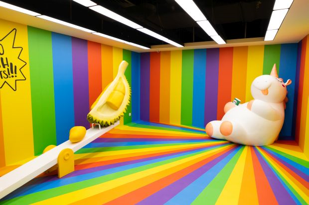 Patung gergasi serta jongkang-jongket durian dalam bilik pelangi yang menjadi tarikan utama di Selfie Museum.