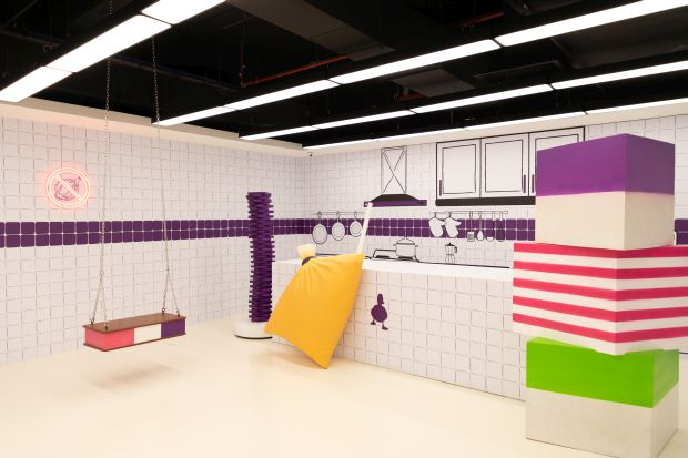 Antara yang paling mencuri tumpuan tentunya ukiran kek cawan berwarna-warni gergasi, kolam yang dipenuhi bebola kuning, buaian, jongkang-jongket durian serta koleksi telefon klasik berwarna merah jambu di dinding.