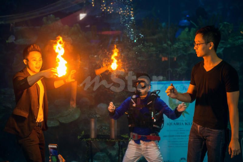 Selain Alex yang mengendalikan penonton di luar tangki, seorang lagi sahabatnya, Desmond Ng pula akan membuat silap mata di dalam air.