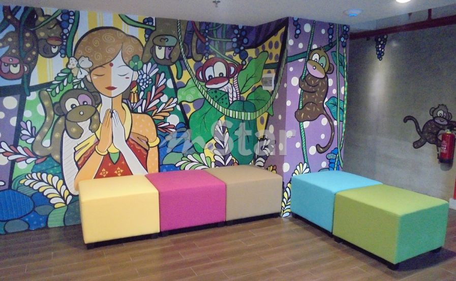Ruangan terakhir berada di kawasan lobi hotel. Ada sofa warna-warni dengan latar belakang mural yang sangat cute. Ada gambar beberapa ekor monyet dan seorang wanita Bali yang seakan-akan mengalu-ngalukan kedatangan tetamu.