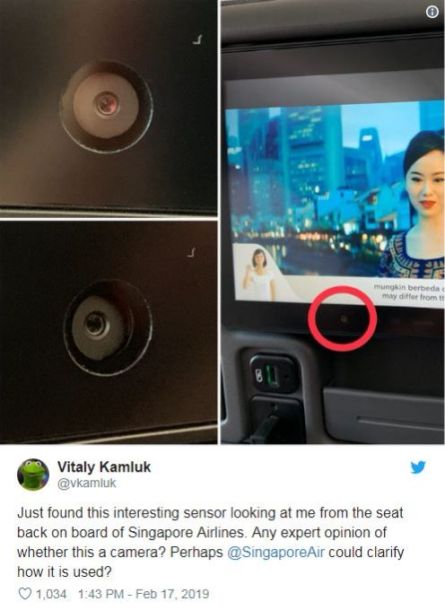 Seorang penumpang penerbangan Singapura memuat naik gambar di Twiter baru-baru ini menunjukkan bahagian belakang kerusi penumpang yang mempunyai kamera, menyebabkan para penumpang udara lain menyuarakan kebimbangan mengenai privasi mereka ketika berada pada ketinggian 30,000 kaki di udara.
