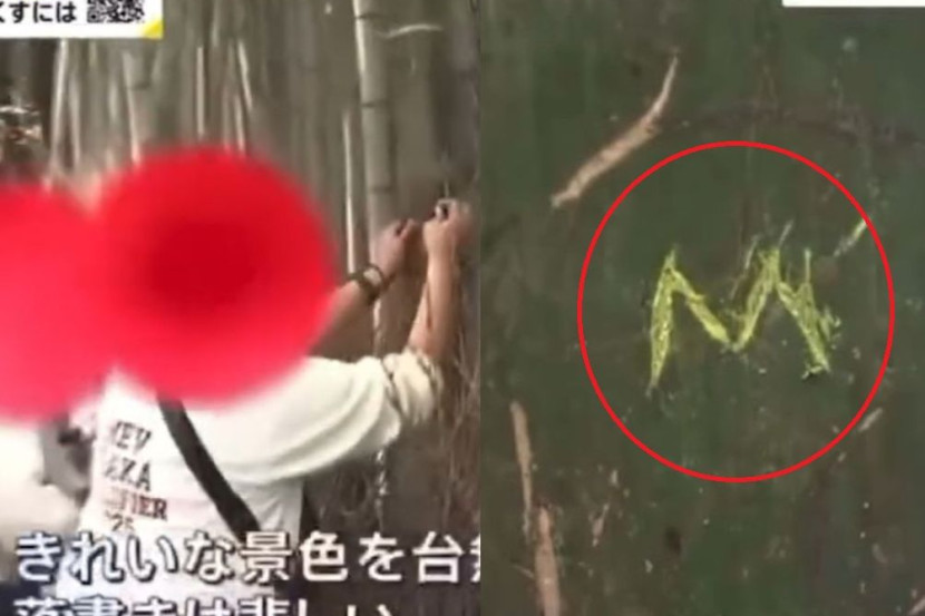 Menerusi video laporan berita berbahasa Jepun yang tular [Tonton Video], sekumpulan pelancong dilihat mengukir batang buluh menggunakan batu di lokasi percutian popular itu.