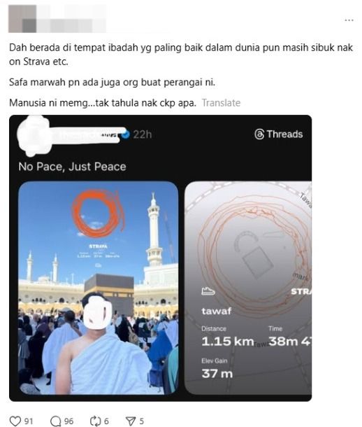 "Sudah berada di tempat ibadah yang paling baik dalam dunia pun masih sibuk nak on Strava. Safa dan Marwah pun ada juga orang buat perangai ni.