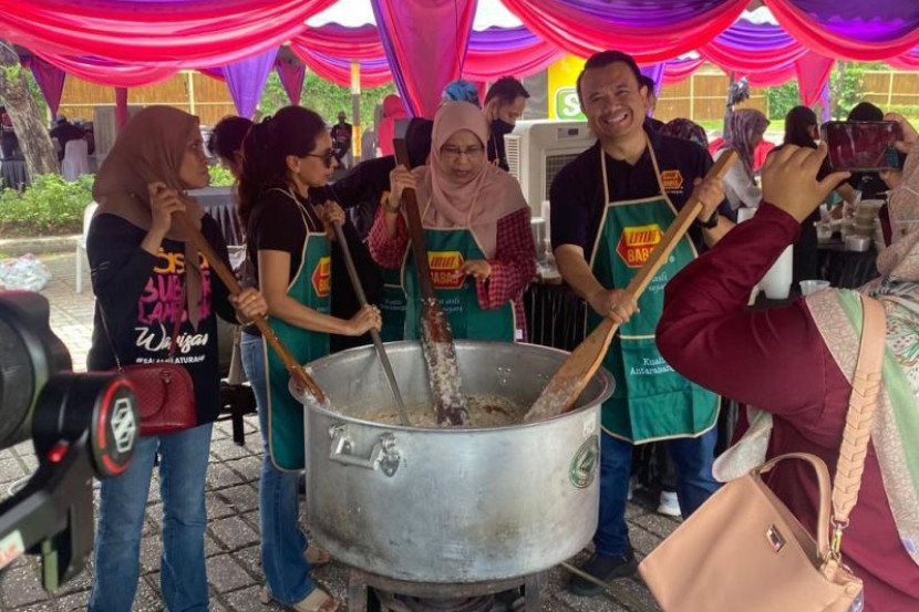 Azrain Mohammad (kanan) mengacau bubur lambuk sempena Rasa Bubur Lambuk Warisan di Dataran Kemerdekaan, Shah Alam.