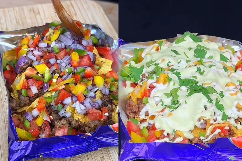 Masukkan daging, bahan hiasan dan sos ke dalam bungkusan kerepek Nachos. Mudah bukan? Selamat mencuba!
