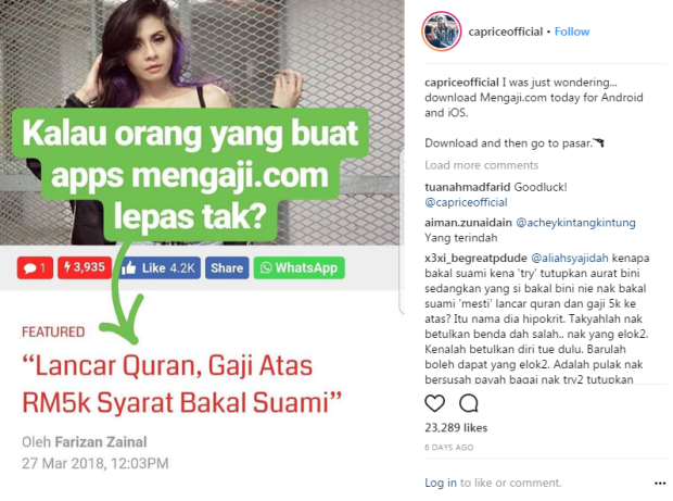 Usikan Caprice menarik perhatian netizen di laman Instagram.