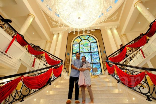 Aliff dan isteri, Nur Shahida bergambar di tangga utama. Lampu gantung tersebut bernilai RM1 juta.