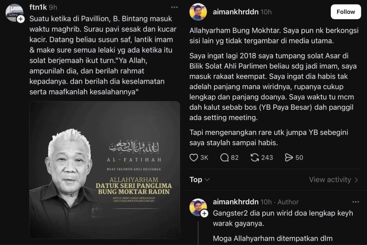 "Makin sebak pula bila begitu ramai yang menulis dan berkongsi tentang kebaikan dan kemuliaan hati Allahyarham Bung Mukhtar. Boleh jadi kerana beliau begitu berbeza dengan apa yang dilihat dan dinilai.