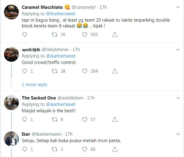 "Sekurang-kurangnya yang Team 20 Rakaat itu tak adalah menghalang kenderaan Team 8 Rakaat. Bijak!," demikian antara beberapa komen ditinggalkan netizen di Twitter.