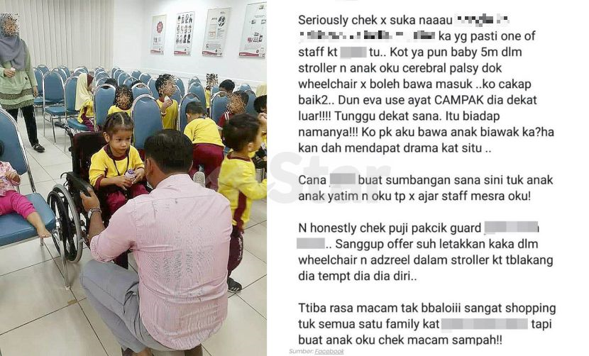 "Kalau iya pun bayi lima bulan dalam 'stroller' dan anak OKU cerebral palsy duduk kerusi roda tidak boleh dibawa masuk, kau cakap baik-baik.