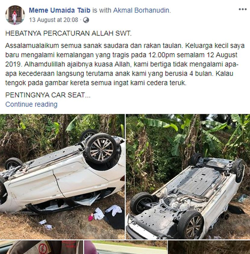 Bercerita lanjut mengenai detik cemas itu, Wan Zaymy memberitahu walaupun kereta yang dinaiki mereka bertiga terbalik namun car seat anaknya yang turut dipasang tali pinggang keledar masih berada dalam posisi sama.