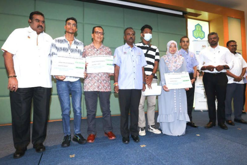 Shamsuddin dan Che Noor Shamimi antara empat waris SRB yang juga penerima Faedah SKSSR Pertubuhan Keselamatan Sosial (Perkeso) yang disampaikan oleh Menteri Sumber Manusia, V.Sivakumar menerusi satu majlis di Pejabat Perkeso Negeri Sembilan, pada Isnin.