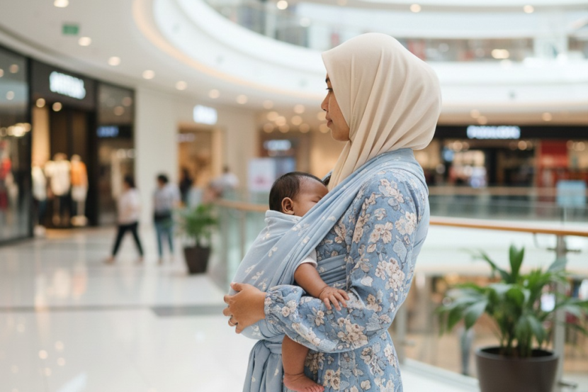 Bagi Norashida, penggunaan baby carrier adalah penyelesaian yang lebih memudahkan kerana tangannya menjadi lebih bebas untuk memegang payung atau menolak troli barangan.