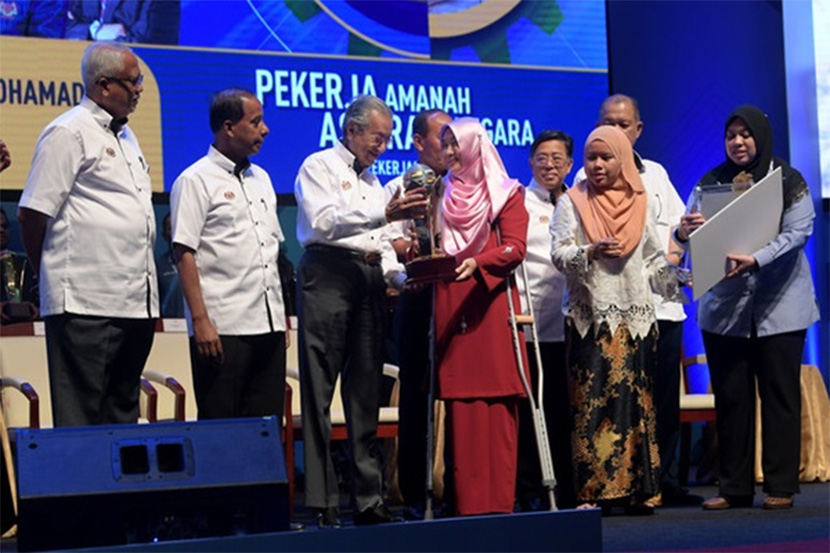 Perdana Menteri Tun Mahathir Mohamad menyampaikan anugerah Tokoh Pekerja Negara (OKU) kepada Aizan Sofia.