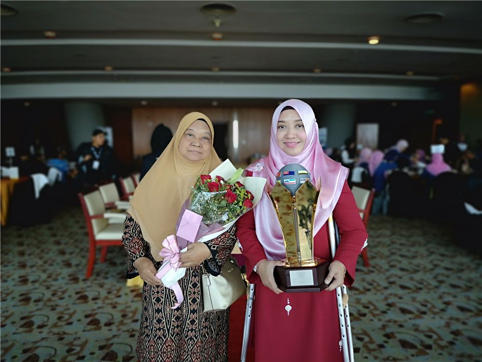 Aizan Sofia disamping ibunya sambil memegang trofi Tokoh Pekerja Negara (OKU) 2019.