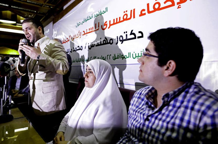 Anak-anak Morsi, Osama Morsi (kiri), Shaimaa (tengah) dan Abdullah ketika dirakam pada sidang akhbar di Kaherah, Mesir pada Julai 2013. - AP