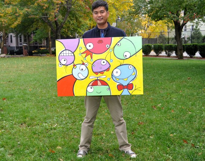Lukisan yang dihasilkannya akan ditinggalkan di tempat-tempat awam, dengan satu nota yang tertulis “Lukisan ini adalah milikmu jika anda berjanji untuk lebih kerap tersenyum.”