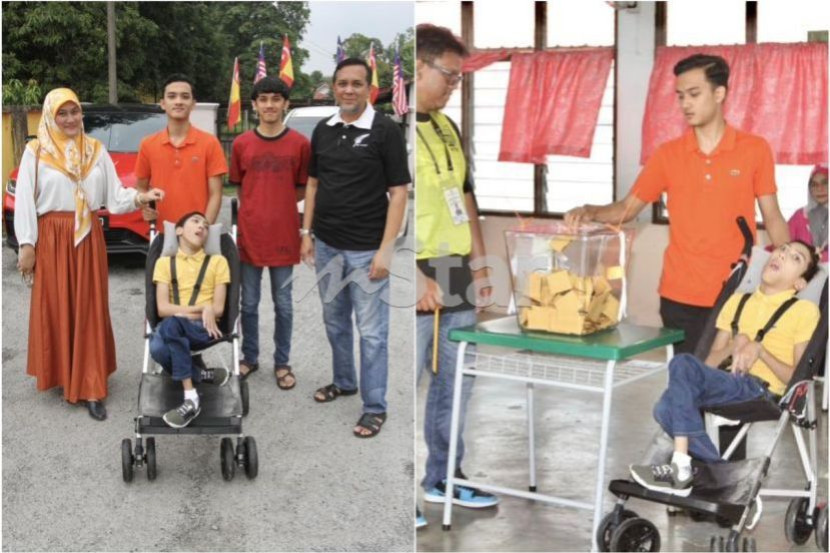Hazril yang menghidap Cerebral Palcy dibawa keluar mengundi oleh keluarganya. -Foto Low Boon Tat/The Star