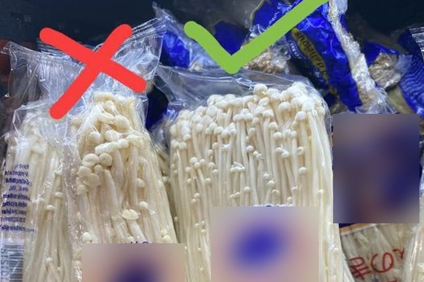 1) Perhatikan cendawan di dalam bungkusan, terutama bahagian kepala. Jika cendawan Enoki masih segar, kepalanya lebih kecil dan batangnya leper.