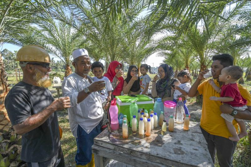 Mohd Zain (dua, kiri) bersama keluarga menikmati air nira kurma di Kampung Teras, Binjai. - Foto Bernama