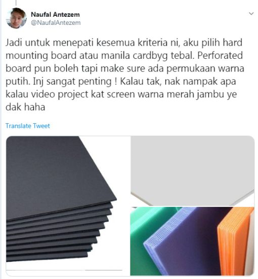 Menerusi semua kriteria ini, Naufal berkata, mounting board, manila cardboard yang tebal termasuk perforated board boleh digunakan sebagai skrin projektor, namun permukaannya harus berwarna putih.