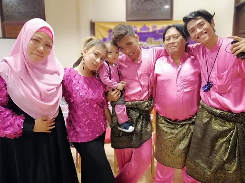 Hamidah bersama keluarga yang sedondon mengenakan persalinan merah jambu pada hari raya.