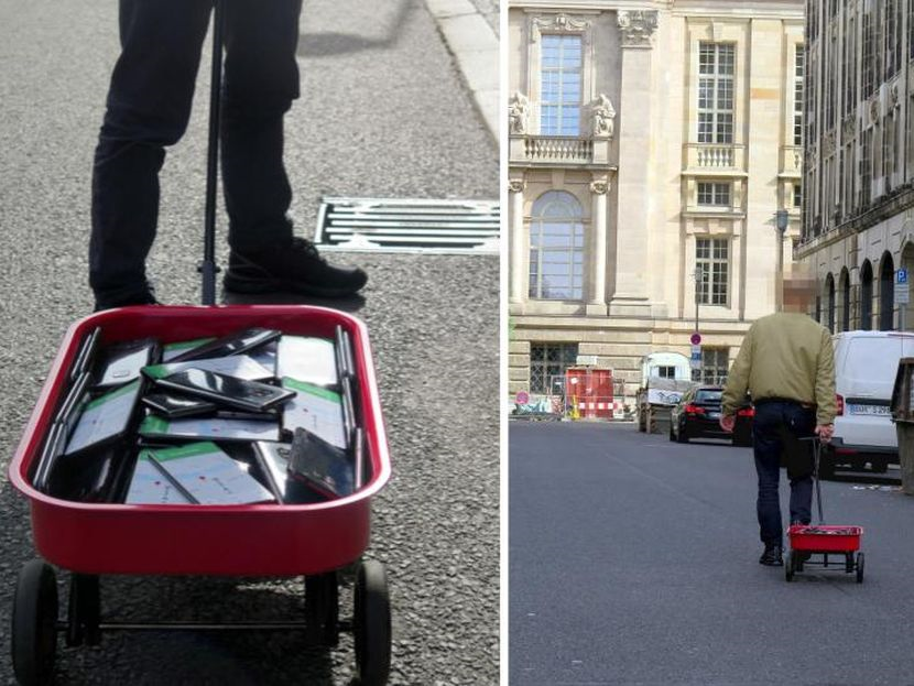 Caranya mudah sahaja! Weckert berjalan kaki membawa 99 telefon bimbit dalam sebuah troli kecil di jalan-jalan lengang sekitar Berlin, Jerman. Semua telefon itu membuka aplikasi Google Maps.