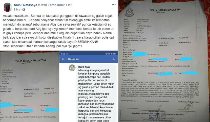 "Semua dah tahu pasal gangguan di kawasan Sungai Galah sejak beberapa hari ini... Kepada penyebar fitnah tu tolong jangan ambil kesempatan menuduh dan terang-terangan sebut nama abang ipar saya seolah-olah dia punca kejadian di Sungai Galah yang konon-konon membela benda tu.