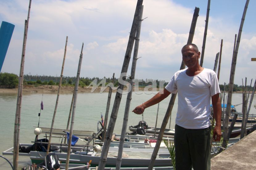 Rosman menunjukkan pesisiran Jeti Pengkalan Nelayan Kesang Laut yang kini mulai didatangi buaya selepas habitat mereka musnah akibat projek pengairan pada 2015.