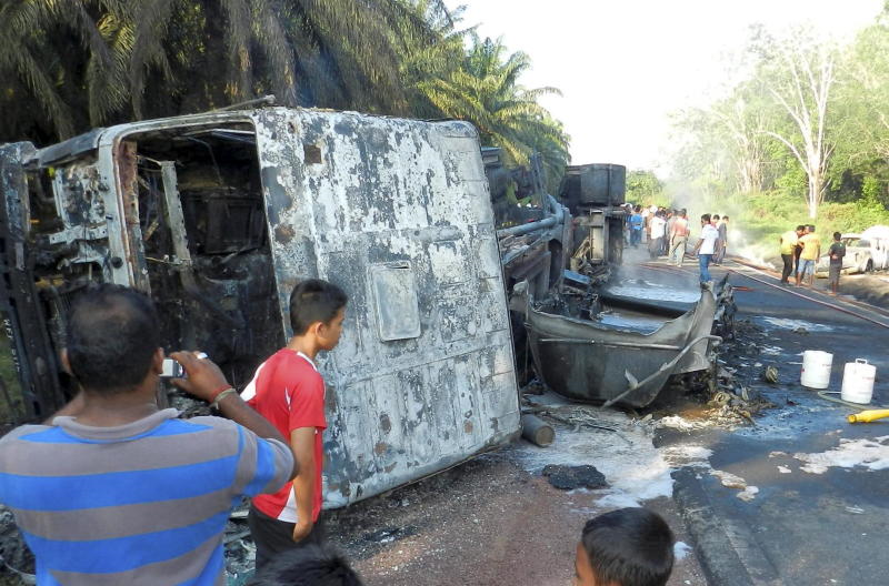 Gambar fail menunjukkan kenderaan pacuan empat roda bertembung dengan sebuah lori tangki sebelum terbakar di Kilometer 37, Jalan Keratong-Bahau berdekatan Palong. Dalam kejadian itu empat mangsa yang menaiki kenderaan pacuan empat roda maut.